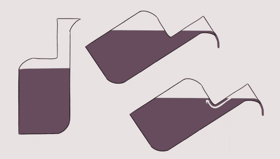 With the bottles I tested, there was often an uncontrolled pouring: ‘glug glug’ effect: Vinegar flows out creating a vacuum inside the bottle until the pressure difference is too high, then a bubble of air quickly rushes in to equalise the pressure through the same opening and the cycle repeats, causing bursts of liquid separated by air bubbles. This effect caused a lot of splashing as well as being very inconsistent and intermittent. Bottle with longer necks in ratio to their body size, had a reduced ‘glug glug effect, providing a smoother and slower pour.