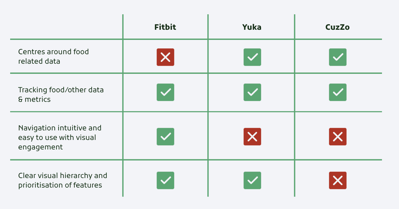 To make sure I wasn’t designing in a vacuum, I conducted a competitive analysis on three apps: CozZo, Fitbit, and Yuka.