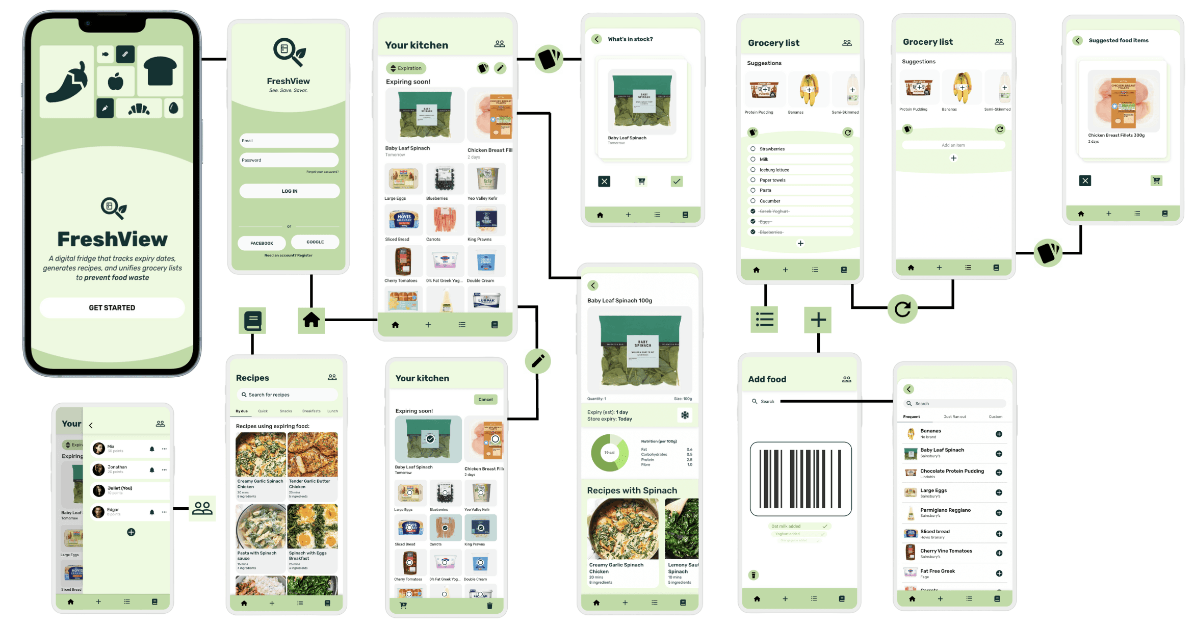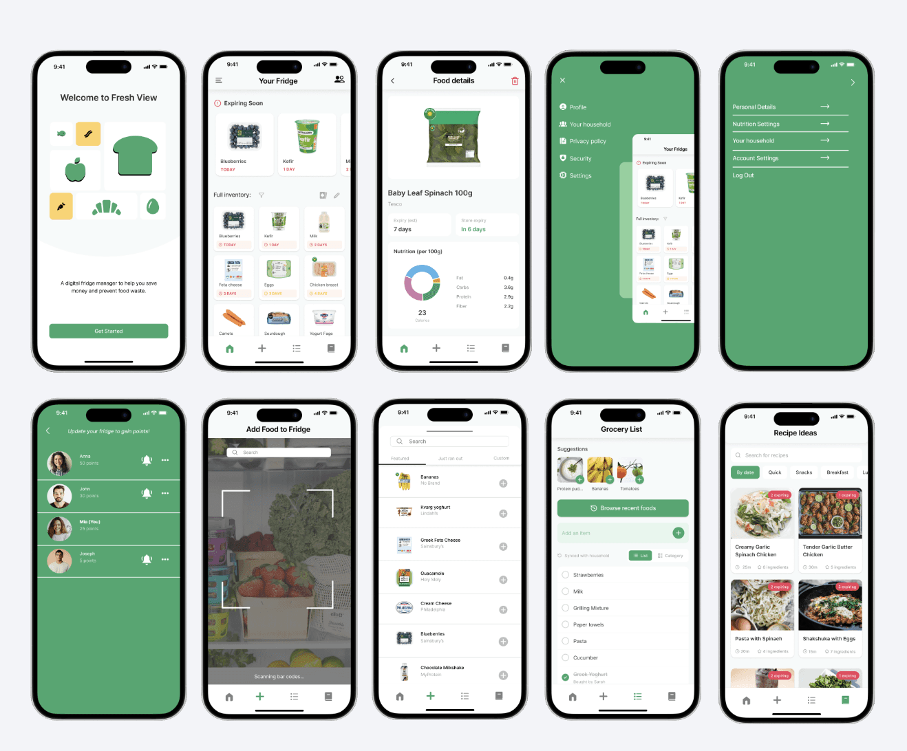 Freshview was designed through an accessibility and social impact lens, recognising that food management often occurs in situationally constrained contexts such as multitasking, fatigue, or shared household responsibilities. To support cognitive and motor accessibility, the app reduces reliance on memory through visual prioritisation of expiring items, notifications as external memory aids, and low-effort input methods such as barcode scanning with manual fallbacks. Clear hierarchy, minimal decision points, and spatial navigation patterns help reduce cognitive load and support users with attention or executive function challenges. From an environmental and social perspective, Freshview addresses the systemic issue of household food waste by making food expiration visible, shared accountability, and actionable nudges. By supporting more inclusive food management habits across multi-person households, the outcome can reduce waste and overspending as well as contribute to more sustainable consumption patterns, thus also lowering the emotional guilt often associated with food disposal. These considerations directly informed the final product experience, positioning Freshview as a tool for individual empowerment and a greater collective environmental impact.