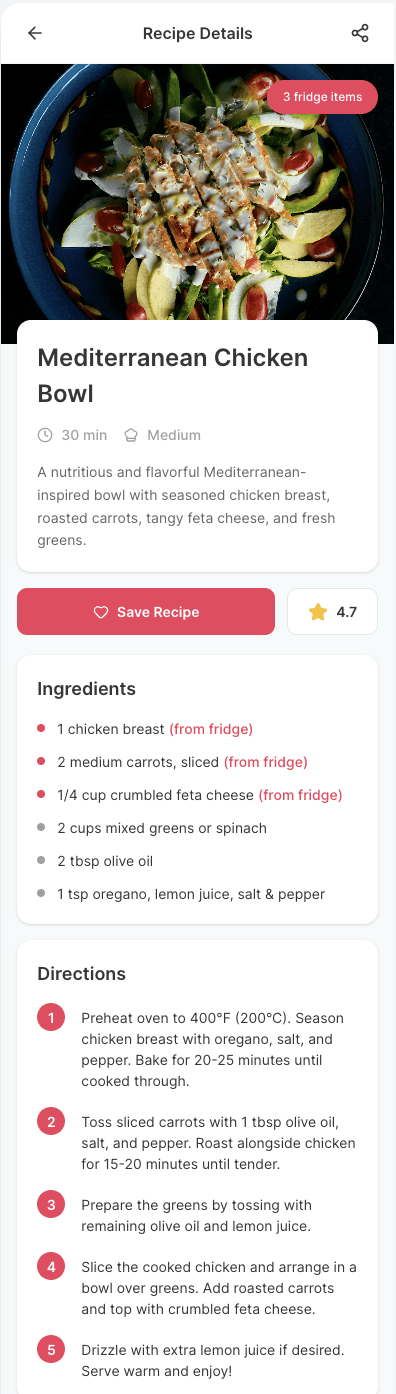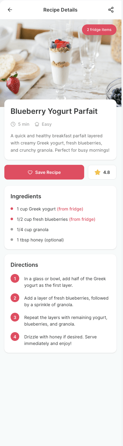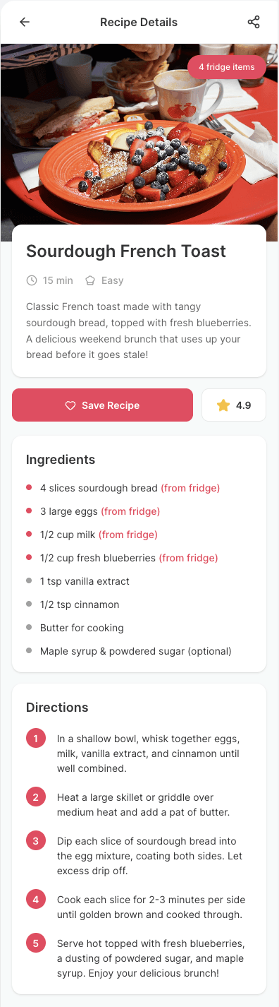 I experimented with where AI could be integrated into the app to maximise leverage and deliver the greatest user impact. Within the recipes area, short, simple recipes could be AI-generated based on existing recipes, specifically working off of what a user has within their fridge (and possibly integrating non-perishables outside of the fridge).
