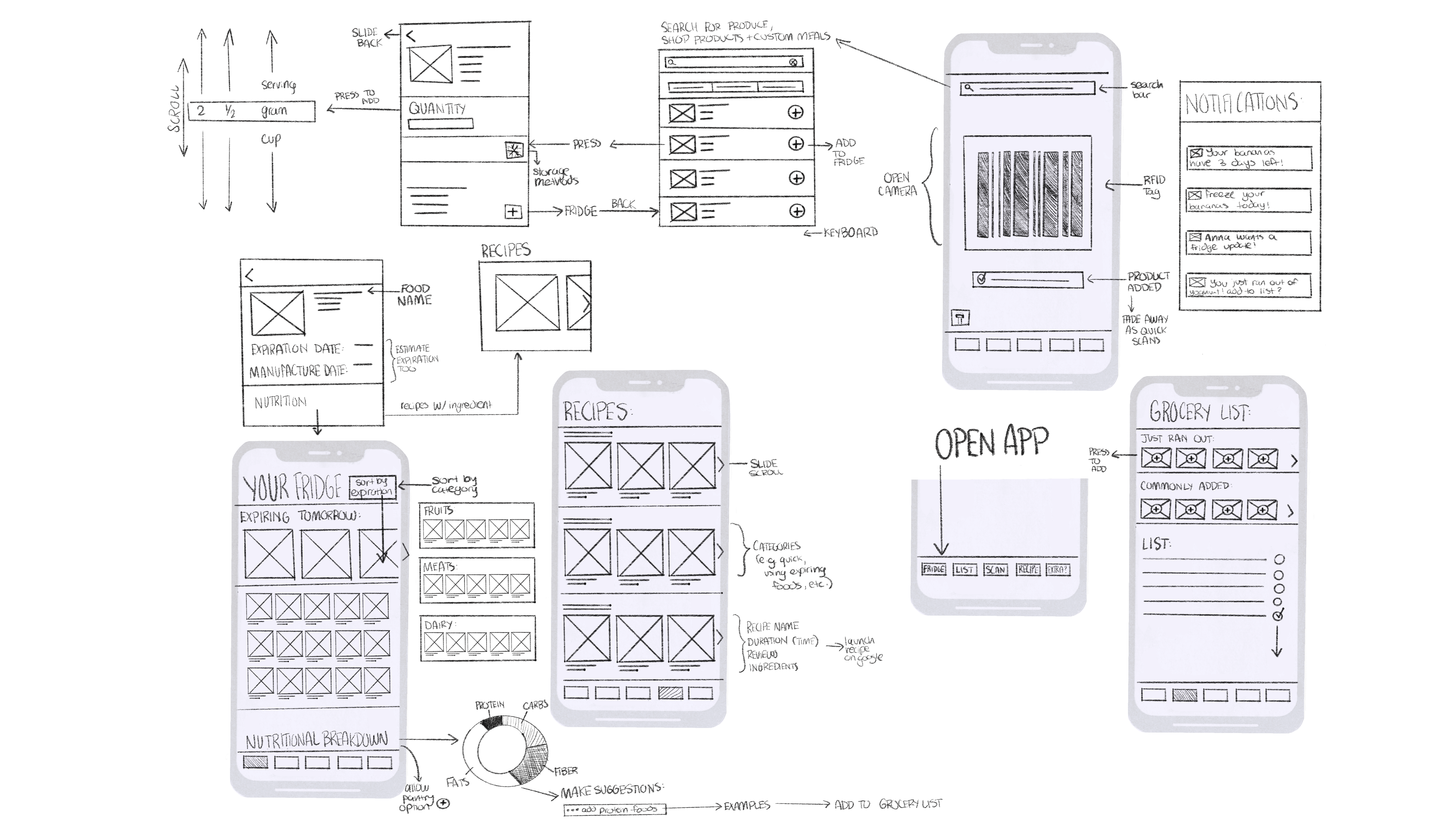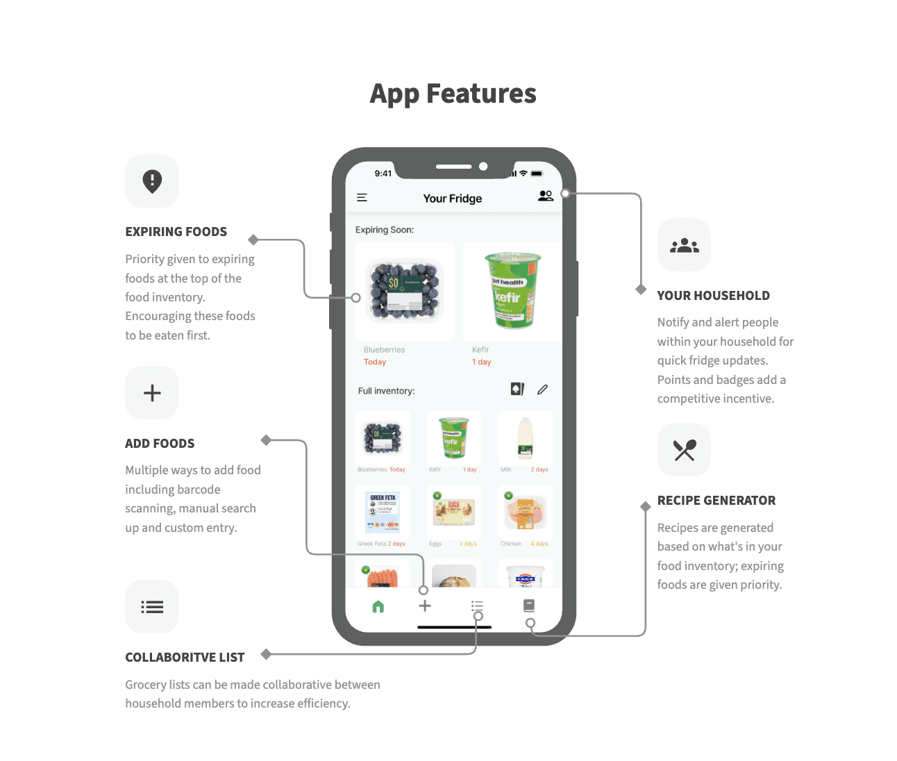 The main features that constituted the mission of the app included: the app’s ability to track and notify users of expiry dates, generate recipes from food inventory and expiring foods, and create a unified digital grocery list for households. It was essentially a household-synced digital fridge that could be accessed from anywhere.