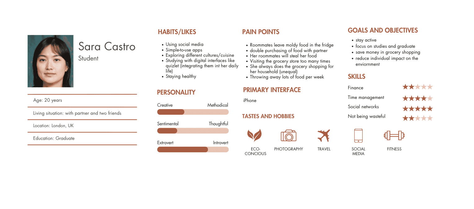 I created user persona to anchor the problem space: Sarah Castro. Her frustrations reflected those I heard consistently in my research. She often forgets expiry dates, feels guilty about wasting food, and struggles to coordinate shopping lists with others in her household.