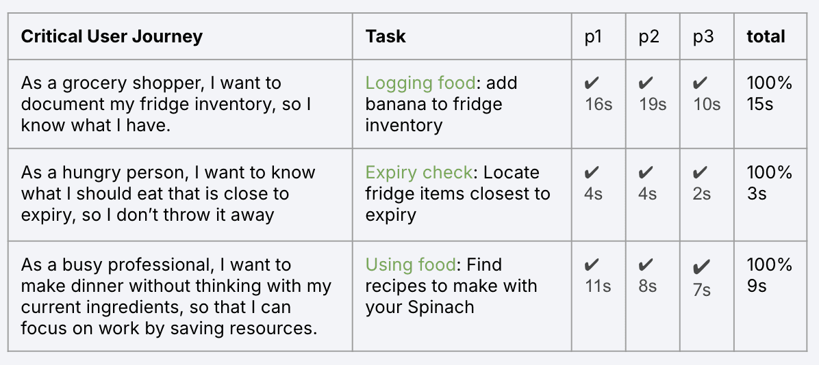 To evaluate success, I relied on my critical user journeys to represent the mvp and determine if the product is solving the user core problem and not just driving engagement. Each journey in the table below directly maps back to the original CUJ defined earlier: incl. understanding what’s in the fridge, identifying items close to expiry, and using those items with minimal effort.